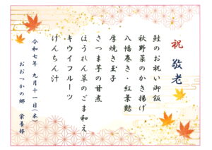 おおつかの郷では、少し早いお祝いになりましたが、「祝・敬老弁当」でご利用者様のご長寿を願い提供させていただきました。