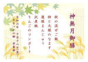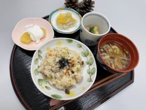 深まる秋の風情を感じ、巡る季節に感謝しながら旬の味覚(さつま芋・しめじ・人参・大根・蓮根・ぎんなん・柿・りんご)をご利用者の皆さまに味わっていただきました。